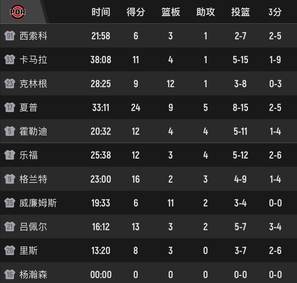 来看下本场数据:夏普24分9板5助攻,格兰特16分,霍勒迪12分4板4助,克林根9分12板,罗威6分11板,里斯8分3板。老鹰的麦科勒姆20分3板4助,奥孔武26分9板2助,约翰逊12分11板6助,沃克11分6板7助。杨瀚森昨日表现那么好,本场无缘出场,卡马拉15投5中,三分9中1,铁成这样,仅得11分,却能上场38分钟,斯普利特的用人遭到质疑。